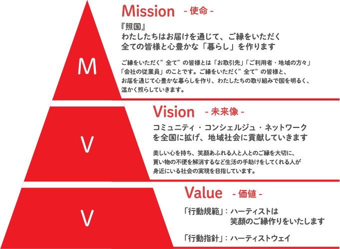 美しい心を持ち、笑顔あふれる人と人とのご縁を大切に、買い物の不便を解消するなど、生活の手助けをしてくれる人が身近にいる社会の実現を目指しています。