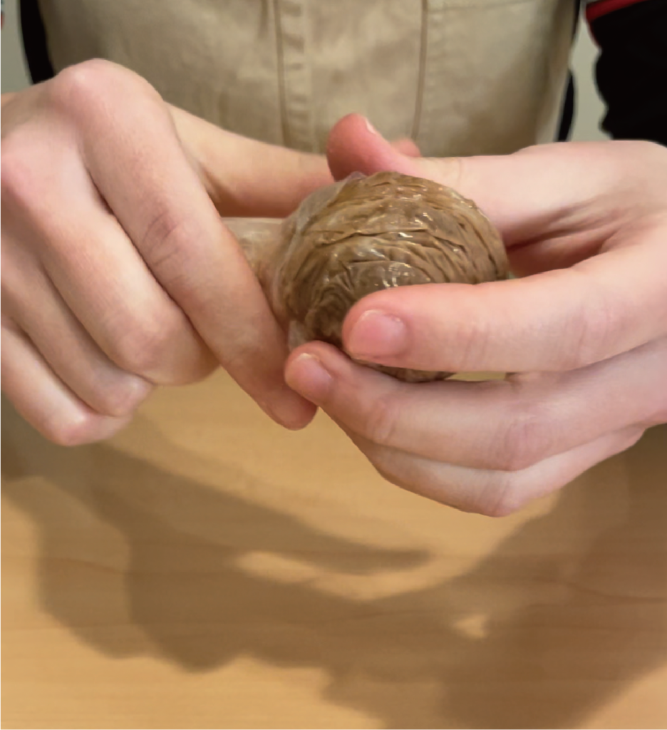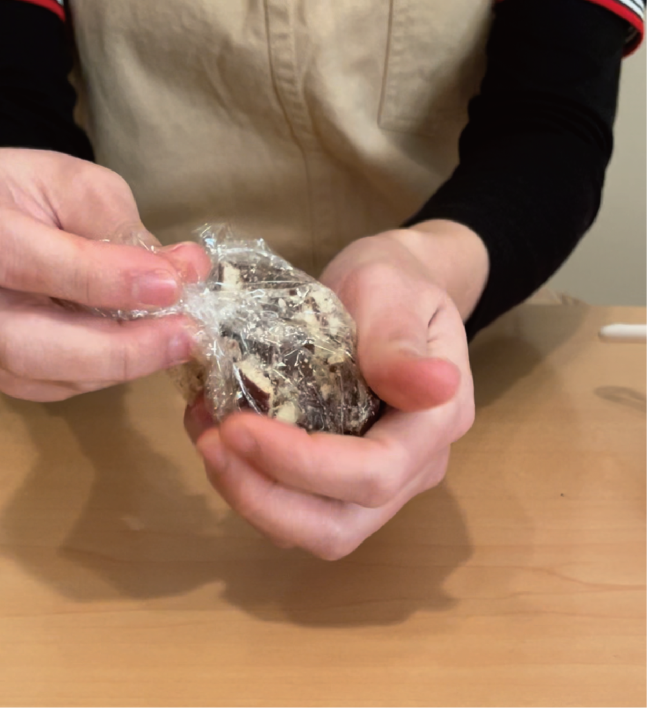2.チョコパイをラップに包んで揉み、崩していきます。